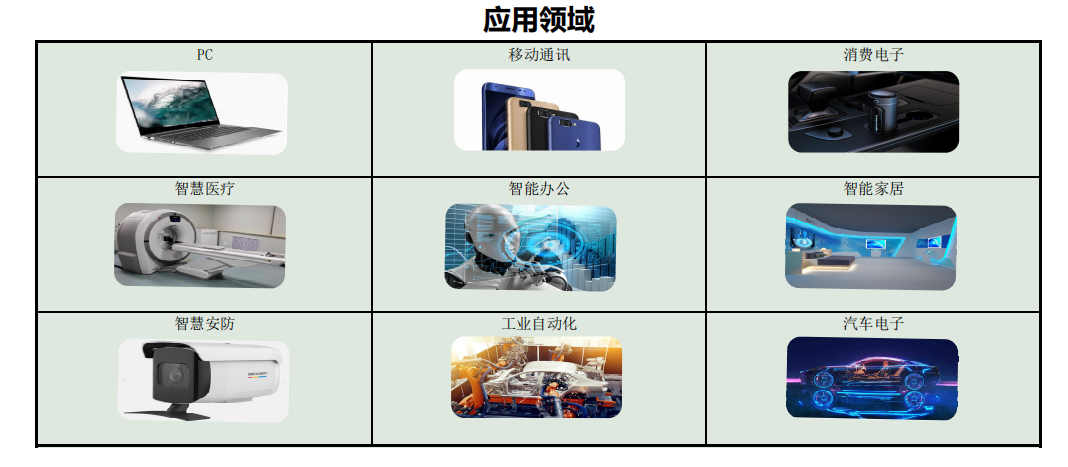 產(chǎn)品廣泛應(yīng)用于:3C(計(jì)算機(jī)、通訊、消費(fèi)電子)、智慧醫(yī)療、智能辦公、智能家居、智慧安防、物聯(lián)網(wǎng)、工業(yè)自動(dòng)化及汽車電子等領(lǐng)域,靈活滿足全球不同客戶的差異化需求以及快速創(chuàng)新的追求。
